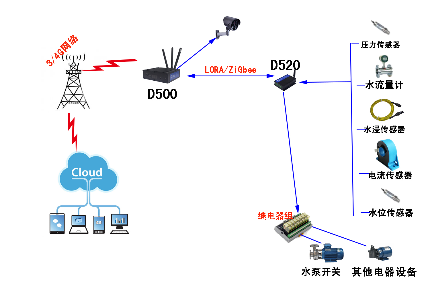 压力传感器,水流量计,水浸传感器,电流传感器,水位传感器,温湿度度传感器,继电器,音频摄像头,D520采集节点,D500 RTU。