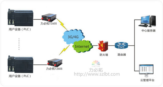 本方案中整个系统由用户设备、力必拓T260S 3G/4G工业路由、服务器三大主要部分组成,如下图所示。服务器通过Internet网络,3G/4G公共移动网络与T260S 3G/4G工业路由建立连接,通过无线路由器的串口(RS-232/485/422)直接与位于各个工业现场的PLC相接,以实现对PLC远程控制。